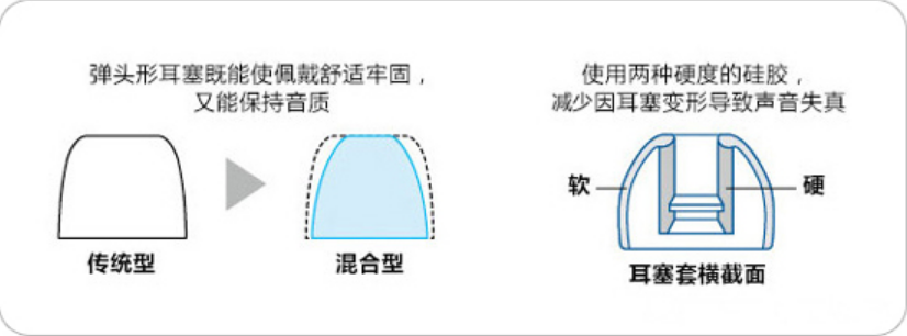采用混合两种硬度硅胶的耳塞,核心部分采用硬质材料保持音质,避免因耳塞变形导致声音失真,外围部分采用柔软材料让您可以上时间舒适的佩戴,而且提高了耳塞密闭性。