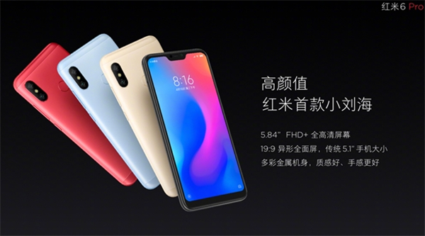 红米6 Pro采用了多彩机身设计,共有樱花粉、流沙金、巴厘蓝、曜石黑、赤焰红五种配色,配备了一块5.84寸的异形全面屏,分辨率2280×1080(19:9),亮度500nit,对比度1500:1,色域覆盖84% NTSC,相当于传统5.1寸手感。