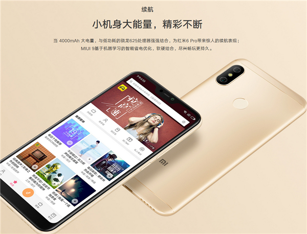 红米6pro续航怎么样?红米6 Pro内置了一块4000mAh大容量电池,它与低功耗的高通骁龙625八核处理器强强结合,为红米6 Pro带来超长续航表现的同时,在运行大型3D游戏和应用时都能游刃有余。