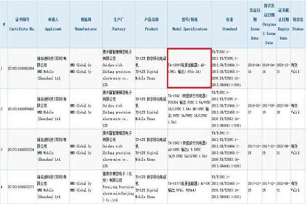 现在国家3C认证网站上出现了HMD的新机,型号包括TA-1099和TA-1109,支持中国移动的TD-LTE网络,还有一些充电信息。