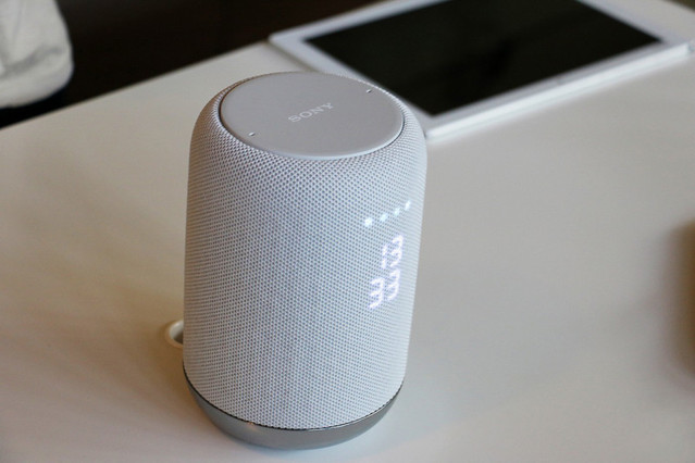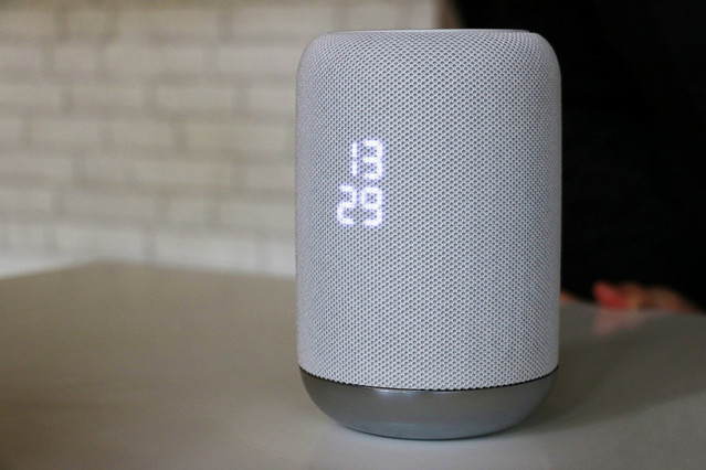 Sony LF-S50G音箱本身设计是很轻薄的,机身正面也有一个LED显示屏幕,会告诉你目前的时间、各项调整数值或是Google Assistant进行聆听时的动画,靠近顶端的位置也有一条声音级别的图标。