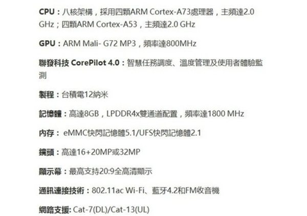 Helio P60导入联发科技CorePilot 4.0技术,管理手机中各种任务执行,提供温度管理、用户体验监测、系统电量分配,同时优化处理器性能及功耗,即使执行多种大运算量的任务,也能提供手机持久的电量。