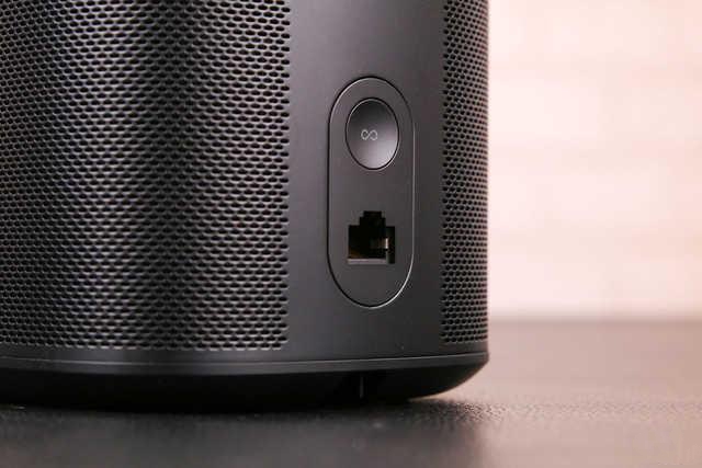 而对于无法弯折的网线,SONOS ONE将网线接口放在了音箱的背面,紧挨在网线接口上方的则是网络配置按键,让SONOS ONE能够接入网络,从而实现一系列的网络功能。