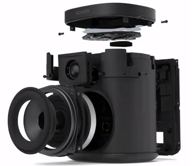 而在我们看不到内部,One基本沿用PLAY:1两分频设计,上方是中高音扬声器(目测是1寸丝绢球顶)+下方中低音扬声器,两个扬声器均为Sonos定制版产品,与之配置的是双路D类功放。