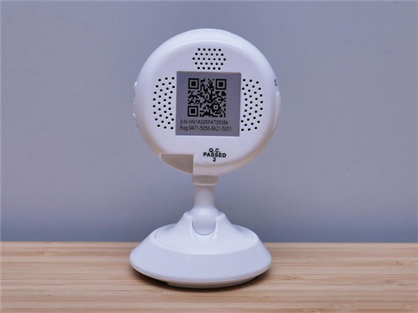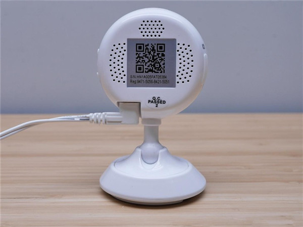 在小兴看看mini的背面正中心有一个二维码,用于将手机APP和小兴看看mini进行绑定。而在摄像头背面则分布着密集的散热孔,其中上方的为发音孔。