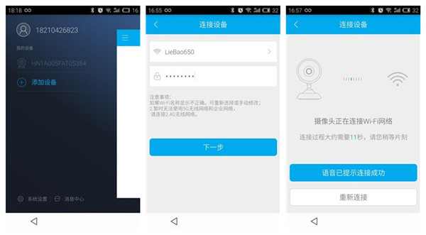 在操作界面选择添加设备,通过扫描摄像头背面的二维码,进入网络配置,然后根据提示将小兴看看连接到无线,配对时间大约需要90S,连接中会有语音提示,当连接成功后,摄像头侧面的信号灯会变为常亮的绿色。