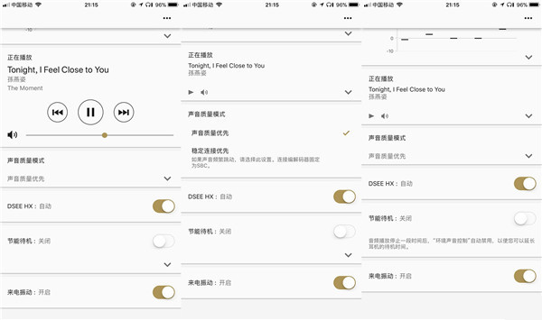 WH-1000XM2的APP设置与WI-1000X几乎没有什么区别,得益于️运算性能强大的DSP,WH-1000XM2的设置非常丰富,这个DSP不仅仅用于系统播放声音前的数字信号处理,还可以用于应对复杂的降噪模式进行更加高级的智能化降噪算法处理,这次WH-1000XM2主打的是更为️智能化的降噪,在APP开启利用"环境声控制"功能,可以调整环境声模式下的环境声收入级别。而且,利用自适应声音控制,可以针对️正在停留、正在步行、搭乘交通工具3种活动状态,根据用户的活动状态自动将环境声控制设置切换至适合的模式。用户也可以从每次需要自己操作的麻烦中解放出来,惬意地欣赏音乐。