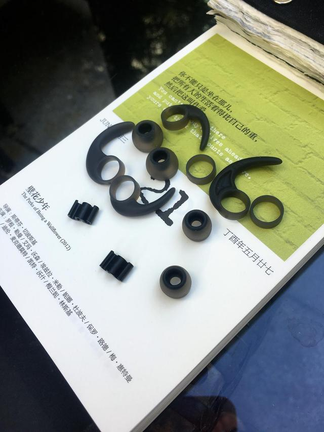 小配件的全家福来一张。小逗号小引号和小句号的组合莫名萌萌哒。另外配有耳帽2对、耳翼2对、环形耳翼1对,能让耳机线变服帖的小线夹2个。