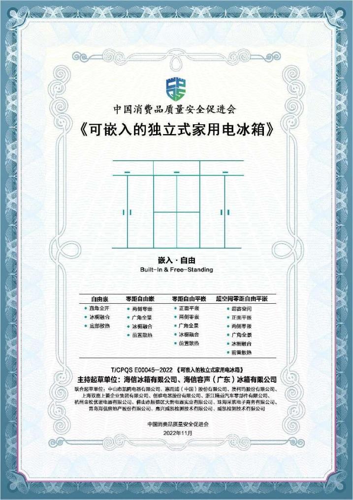 12月17日,容声2022年度新品发布会重磅来袭,会上,由容声冰箱牵头制定的《可嵌入的独立式家用电冰箱》行业标准已被批准发布。中国消费品质量安全促进会副理事长、消费电器工作委员会主任陈伟升认为,容声以此标准为依据,真正在三维空间实现冰箱和橱柜的完美融合,引领了行业的发展方向。
