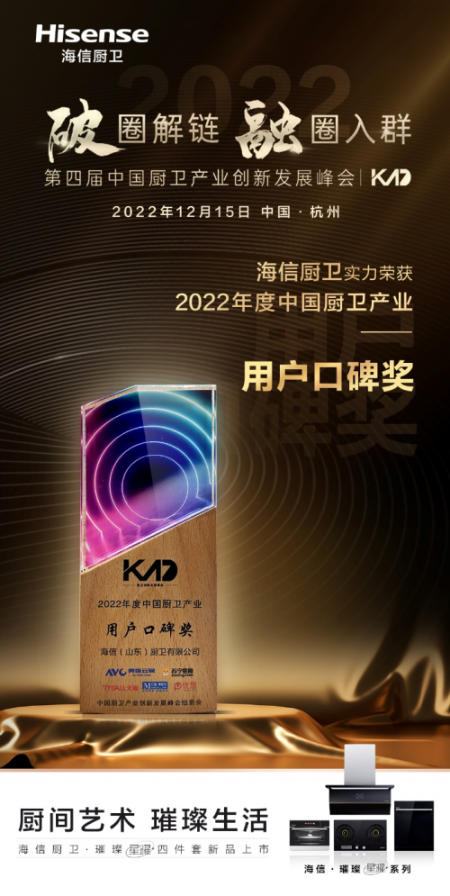 2022年12月15日,以“破圈接链,融圈入群”为主题的“2022(第四届)中国厨卫产业创新发展峰会”在杭州召开。本次峰会由行业协会指导,汇集行业专家、品牌方、地产配套采购商、家装公司、设计师、电商平台、渠道商、代理商、经销商以及各大专业及流量媒体,共同探讨新形势之下,厨电产业的持续健康升级之路。海信厨卫,身为厨电行业当仁不让的“领头军”应邀出席,以其领先于行业的产品品质及设计理念,获得了现场专家和媒体的高度关注与认可,并成功斩获了“2022年度中国厨卫产业用户口碑奖“,持续助力行业发展与升级。