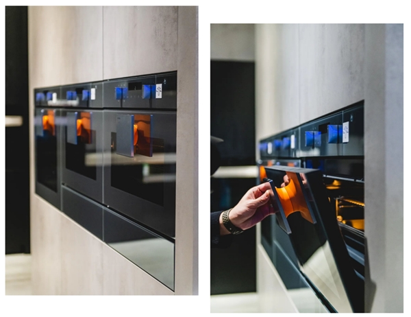 不仅智能科技和高效节能的品质令人倾心,细节上也经得起推敲,如把手后面点缀了显眼的亮橘色,通过金属质感的玻璃面板反射而出,一开一合间,增添了些许温暖,亦体现着饱含热情的艺术生活。