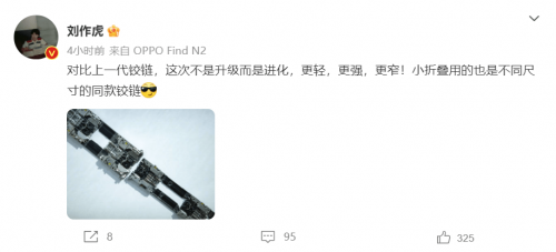 另一方面,由于小折叠手机的弯折部分会比横向折叠有着更为集中的受力,因此它们的铰链结构与屏幕强度有着更为严格的打磨标准,以此来确保屏幕折痕控制以及使用寿命。而我们能看到,OPPO在Find N2系列两款产品上均采用了联手安费诺飞凤而搭载的超轻固精工拟椎式铰链,能够实现“更轻、更窄、更紧凑”的效果,因此这能为OPPO Find N2 Flip带来整体尺寸、质感、强度等方面的有效优化。