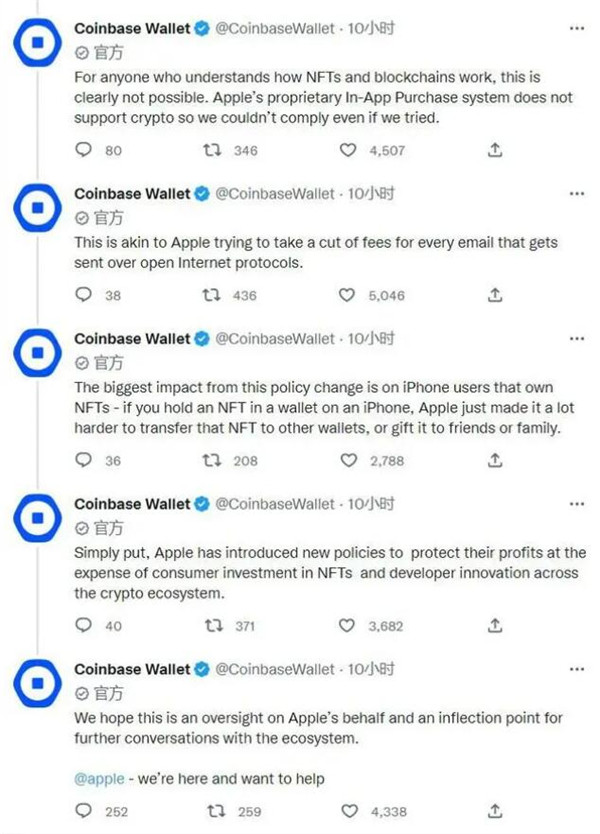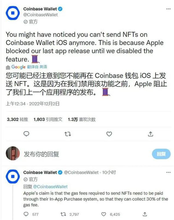 Coinbase Wallet 官方 Twitter 账号报告称,向苹果提交的应用更新申请已经遭到拒绝,苹果要求开发者在应用禁用发送 NFT 的功能。苹果表示转移 NFT 资产所收取的费用必须要经过 App Store 规定的应用内购买系统,苹果需要从中抽取 30% 的佣金。