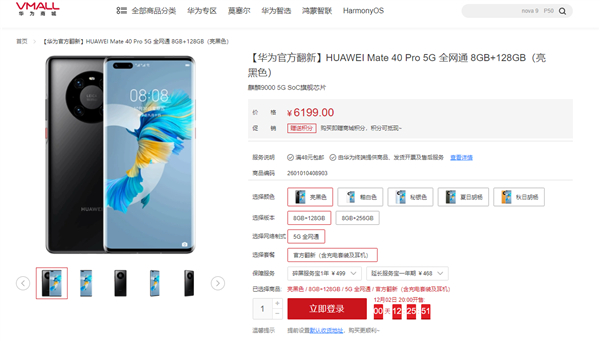 据了解,华为Mate 40 Pro官翻版提供8GB+128GB、8GB+256GB两种配置可选,售价分别为6199元和6699元,比发布时的原价便宜了300元。