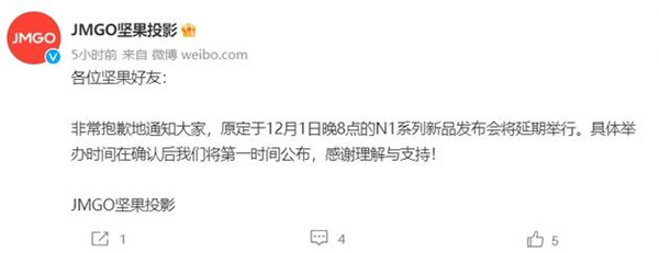 坚果投影官方宣布,原定于 12 月 1 日晚 8 点的 N1 系列新品发布会将延期举行。具体举办时间在确认后官方将第一时间公布,感谢理解与支持。