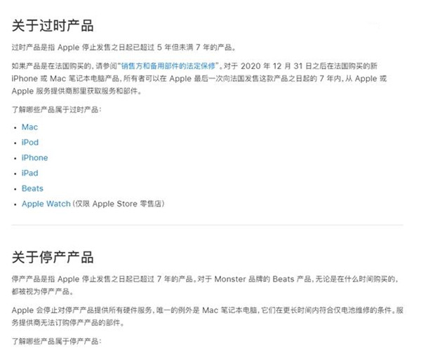 停产产品清单上的设备是苹果公司已经停售了超过七年的产品,苹果公司会停止对淘汰产品的所有硬件服务,服务提供商无法为淘汰产品订购零部件。