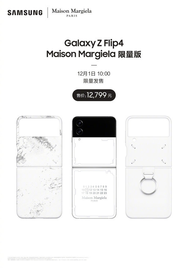 12月1日上午10:00,三星与巴黎高级定制时装屋Maison Margiela携手推出的三星Galaxy Z Flip4 Maison Margiela限量版正式开售,售价12799元。