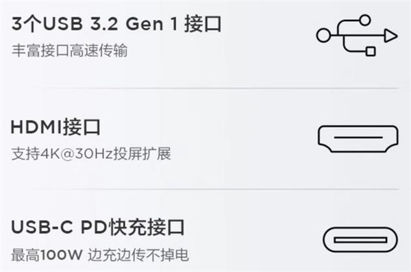 小新五合一扩展坞 D1 配备 5 个接口,包括 3 个 USB 3.2 Gen 1 接口、HDMI 接口、USB-C PD 快充接口。其中,HDMI 接口支持 4K 30Hz 投屏扩展,PD 接口支持最高 100W 快充。