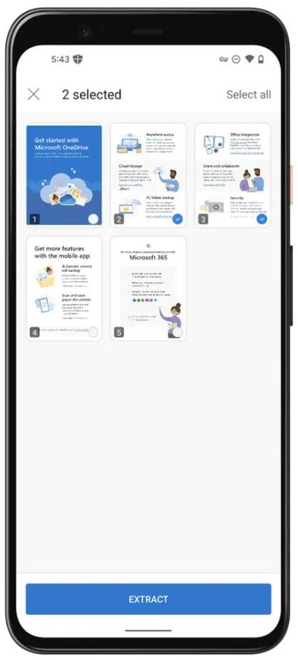 安卓版 OneDrive 启用该功能之后会跳出当前 PDF 文件的页面预览,用户可以根据需求挑选所需的页面,选择完成之后点击“提取”(Extract)操作即可。提取完成之后,OneDrive 会向用户咨询新 PDF 文件的保存路径,用户可以根据需要保存到想要的位置。