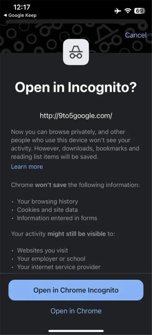 用户启用该特性之后再点击外部链接,就会跳出“Open in Incognito?”(在隐身模式下打开该链接?)的提醒。页面还详细介绍了浏览会话如何保护你的隐私等等信息,从而更好的为你提供保护。