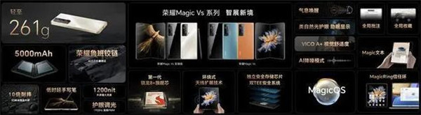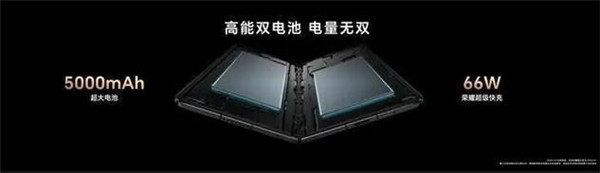 荣耀 Magic Vs 持续优化电池技术,基于关键铰链技术进步带来的全新结构设计,容纳 5000mAh 超大电池容量,续航水平实现大屏视频播放 12.6 小时、大屏阅读 17.3 小时以及大屏导航 13.1 小时,该机支持 66W 快充。