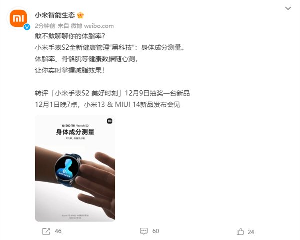 今天,小米智能生态官方宣布,小米手表S2成功实现了身体成分测量功能,用户只需要佩戴设备,就能像测试心率一样,测试身体的体脂率、骨骼肌等健康数据。