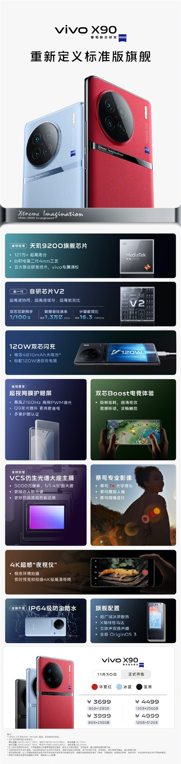 11月30日消息,今日上午10:00,vivo X90系列中的中杯机型——vivo X90将率先迎来首销,提供8GB+128GB/256GB、12GB+256GB/512GB四种配置,售价分别为3699元、3999元、4499元、4999元。