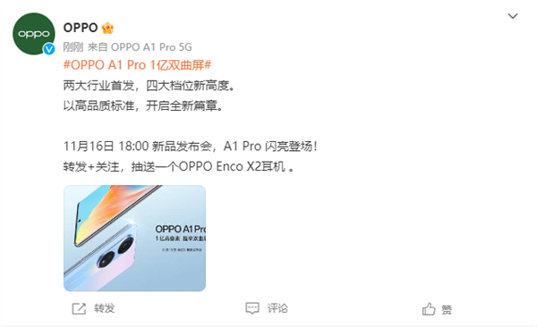 今天,OPPO宣布,将在11月16日召开新品发布会,为用户带来A系列的新品:OPPO A1 Pro。
