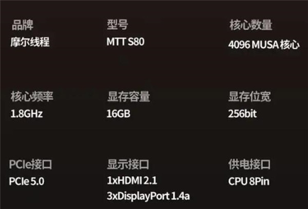 接口方面,MTT S80 显卡配备了 3 个 DisplayPort 1.4a 接口和 1 个 HDMI 2.1 接口,支持 1080P 360Hz 画面,还能同时输出 4 路 7680*4320 @ 30Hz 的 8K 超高清画面。