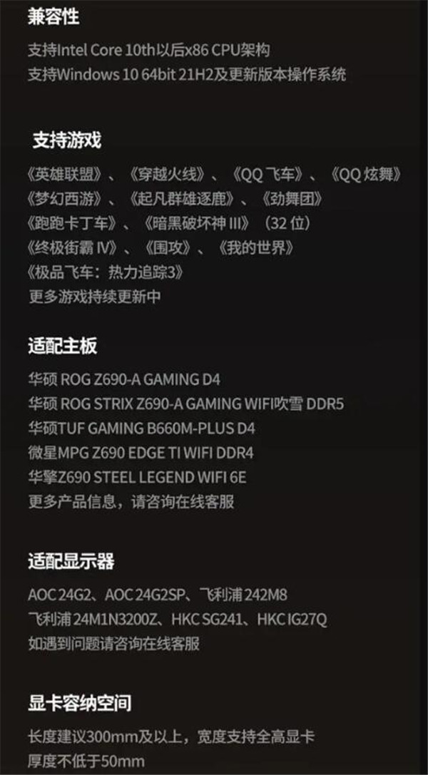MTT S80 支持《英雄联盟》《穿越火线》《QQ 飞车》《暗黑破坏神 3》(32 位)《围攻》《极品飞车:热力追踪 3》《梦幻西游》等多款游戏。适配华硕 ROG Z690-A GAMING D4、华硕 ROG STRIX Z690-A GAMING WIFI 吹雪 DDR5、华硕 TUF GAMING B660M-PLUS D4、微星 MPG Z690 EDGE TI WIFI DDR4、华擎 Z690 STEEL LEGEND WIFI 6E 等多款主板。