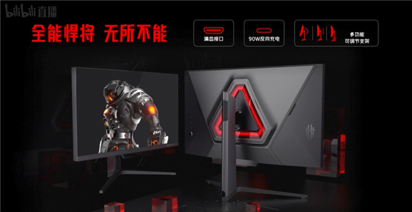 接口部分,红魔电竞显示器内置USB*2、USB 3.0、DP、HDMI 2.1接口,以及支持90W Type-C接口反向充电。