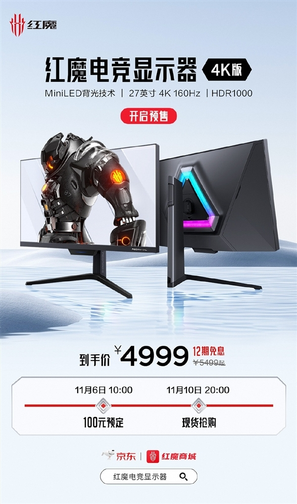 根据红魔官方消息,红魔电竞显示器4K版将于今晚8点正式首销,到手价4999元,支持12期免息分期。