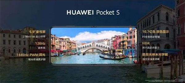 配置上,华为 Pocket S 采用高通骁龙 778G 4G 处理器,超冷柔性石墨烯散热;搭载 6.9 英寸 2790 × 1188 分辨率 OLED 屏幕,最高支持 120Hz 刷新率,1440Hz 高频 PWM 调光,300Hz 触控采样率,支持 10.7 亿色,P3 广色域;外屏采用 1.04 英寸 340 × 340 圆形 OLED 屏幕。华为 Pocket S 还支持 HDR Vivid 视频显示,色彩及层次更丰富,明暗对比更强。同时还采用了防反光纳米光学膜,阳光下也清晰。