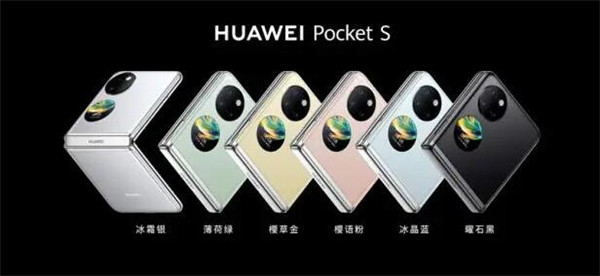 华为 Pocket S 从自然万物汲取灵感,融合高级时尚气息,发布六款时尚配色,支持曜石黑、冰霜银、薄荷绿、樱语粉、樱草金、冰晶蓝。冰霜银使用的磨砂玻璃,手感细腻且不显指纹。另外五款配色采用亮面玻璃,形成色泽通透的陶瓷质感,在不同的光线下,能营造出空间感和立体感。