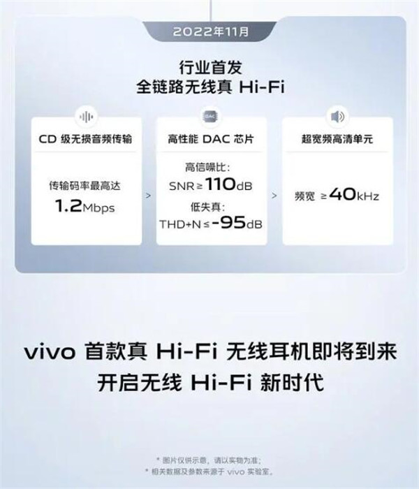 11 月 9 日消息,vivo 宣布将在本月推出全球首款真 Hi-Fi 无线耳机,行业首发全链路无线真 Hi-Fi,传输码率最高达 1.2Mbps,搭载高性能 DAC 芯片,配备 40kHz 以上超宽频高清单元。
