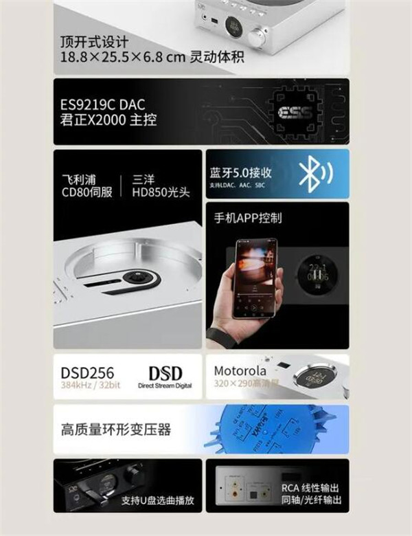 CD 读取方面,山灵 EC3 采用了飞利浦 CD80 伺服系统 + 三洋 HD850 光头的配置,这套配置已经在多台 CD 机上得到应用验证,具有更强的稳定性和可靠性,读碟能力强大,纠错能力强。山灵 EC3 还使用了 ES9219C DAC 用于解码。