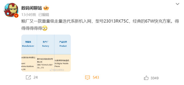 昨日,数码博主 @数码闲聊站 爆料,粮厂又一款重量级走量迭代系新机入网,型号23013RK75C,经典的67W快充方案。