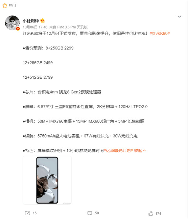 11月7日,据相关爆料,即将在12月发布的红米K60系列售价、配置已经曝光,新机8+256GB起售价预计2299元、12+256GB售价预计2499元、12+512GB售价预计为2799元,最顶配不超过3000元,依然走性价比路线。