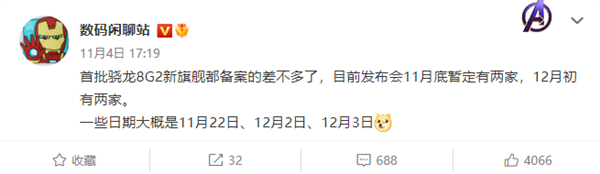 据数码闲聊站爆料,目前首批骁龙8 Gen2机型已经蓄势待发,11月底会有两家厂商率先发布,首发日期大概是11月22日。