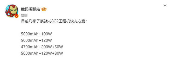 11月5日,某数码博主集中爆料了四款子品牌的骁龙8 Gen2工程机快充方案,这四款机型全部都配备了4700毫安或者以上的大容量电池,充电速度也都在100W或者以上,部分机型还支持无线充电,最高50W。