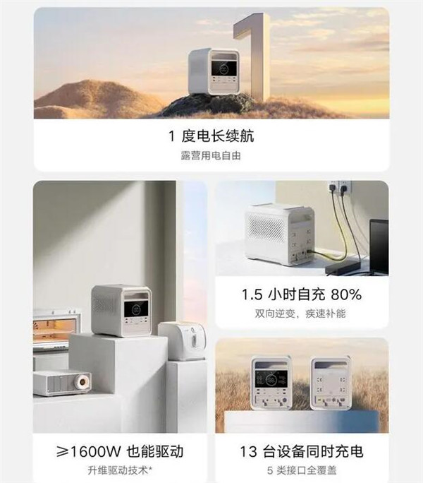 这款户外电源采用了 280500mAh 大容量电芯,可为大部分露营设备提供多次供电续航,可以支持 220V / 1600W 大功率输出,搭载升维驱动技术,超过 1600W 功率的大功率电器也能带得动。