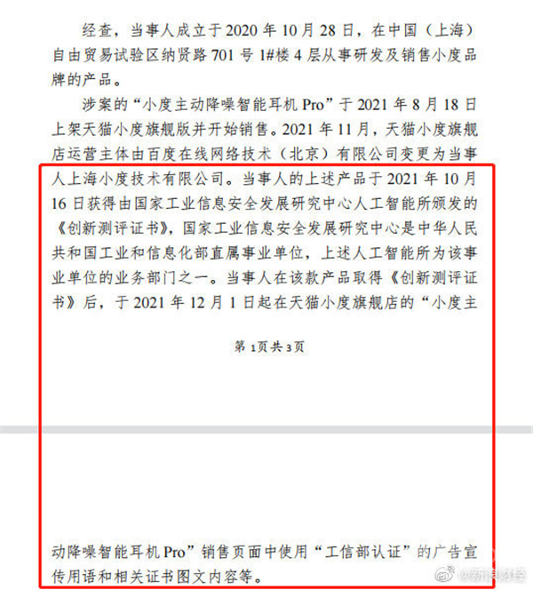 处罚事由显示,当事人销售的“小度主动降噪智能耳机Pro”获得由国家工业信息安全发展研究中心人工智能所颁发的《创新测评证书》,国家工业信息安全发展研究中心是工业和信息化部直属事业单位,上述人工智能所为该事业单位的业务部门之一。