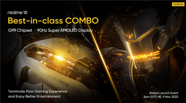 据 realme 官方在海外的消息,真我 10 系列将于 11 月 9 日在海外发布,国内发布时间未知,真我 10 搭载联发科 Helio G99 处理器,配备 90Hz Super AMOLED 屏。