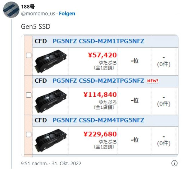 近日,这款 SSD 在日本的售价曝光,根据爆料者 @momomo_us 发现的信息,该 SSD 的售价为: