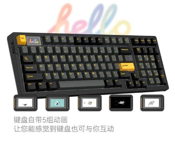 值得一提的是,该键盘搭载了一块1.14英寸TFT彩色显示屏,还自带5组动画,并可以显示键盘剩余电量。