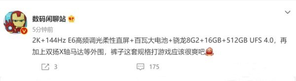 据悉,iQOO 11将搭载2K+144Hz E6高频调光柔性直屏,内置支持百瓦快充的大电池,搭载第二代骁龙8移动平台,拥有16GB+512GB超大存储空间,闪存方面使用的是UFS 4.0,还拥有双扬马达等优秀外围配置,可以说确实是用料满满。