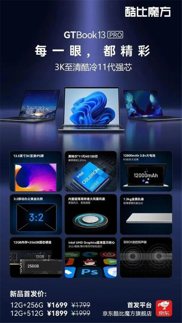 10 月 27 日消息,今日,酷比魔方 GTBook13 Pro 笔记本正式发布并开启预售,采用 13.5 英寸屏幕,搭载英特尔赛扬 N5100 处理器,首发到手价 1699 元起。