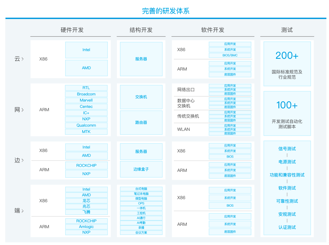 为了适应新的市场需求与发展趋势的变化升级,在2016年到2026年,智微智能适时地调整了公司战略方向,开始在“端边云网”新的协同架构下,拓宽产品线,比如服务器、交换机、网安设备、边缘设备等等,同时智微智能组建了视频方案部,加强软件的开发的投入,深入部署各类智能场景和产业,为客户提供端边云网一站式的硬件方案和软件增值服务。公司内部也面向不同的行业与市场,规划了清晰的体系,以支撑产品的研发、生产与销售运维。智微智能的研发设计与供应链也从通用转向了专用,生产制造由规模化向规模化+柔性化转变。