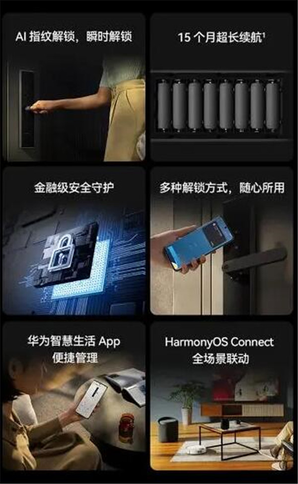 华为智能门锁 SE 支持 AI 指纹解锁、NFC 卡片解锁、紧急钥匙解锁、安全密码、华为手机解锁、华为手表等多种解锁方式,其中 AI 指纹解锁时间仅为 0.5 秒,每次解锁能学习和完善用户指纹特征,经过指纹测试库 AI 训练,认假能力高于支付级别。
