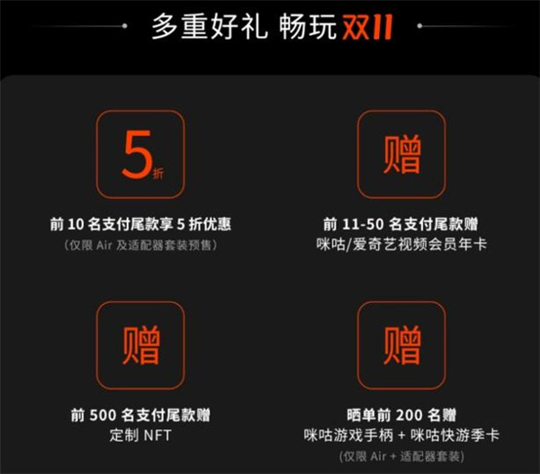 迎双十一,Nreal 目前开启了让利活动,包括前 10 名付尾款,享五折优惠、11-50 名付尾款,送爱奇艺 / 咪咕视频年卡(二选一)、前 500 名付尾款,赠送定制 NFT 数字藏品、晒单前 200 名,送咪咕游戏手柄 + 咪咕快游季卡,以及享 12 期免息分期等等活动,感兴趣的玩家朋友,不要错过这次机会了。